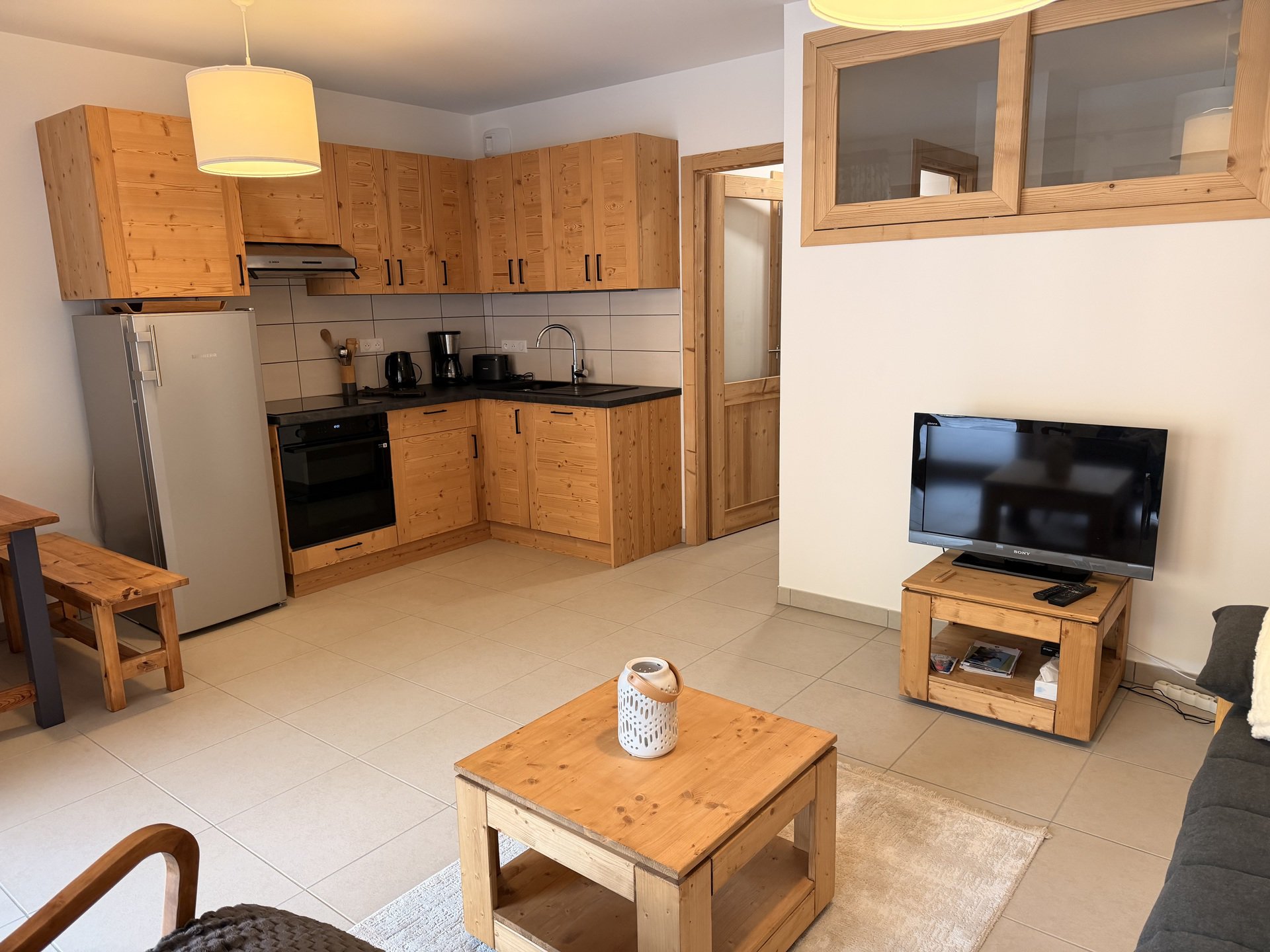 Séjour/cuisine (four, frigo, lave-vaisselle, plaque vitrocéramique, canapé, télévision.