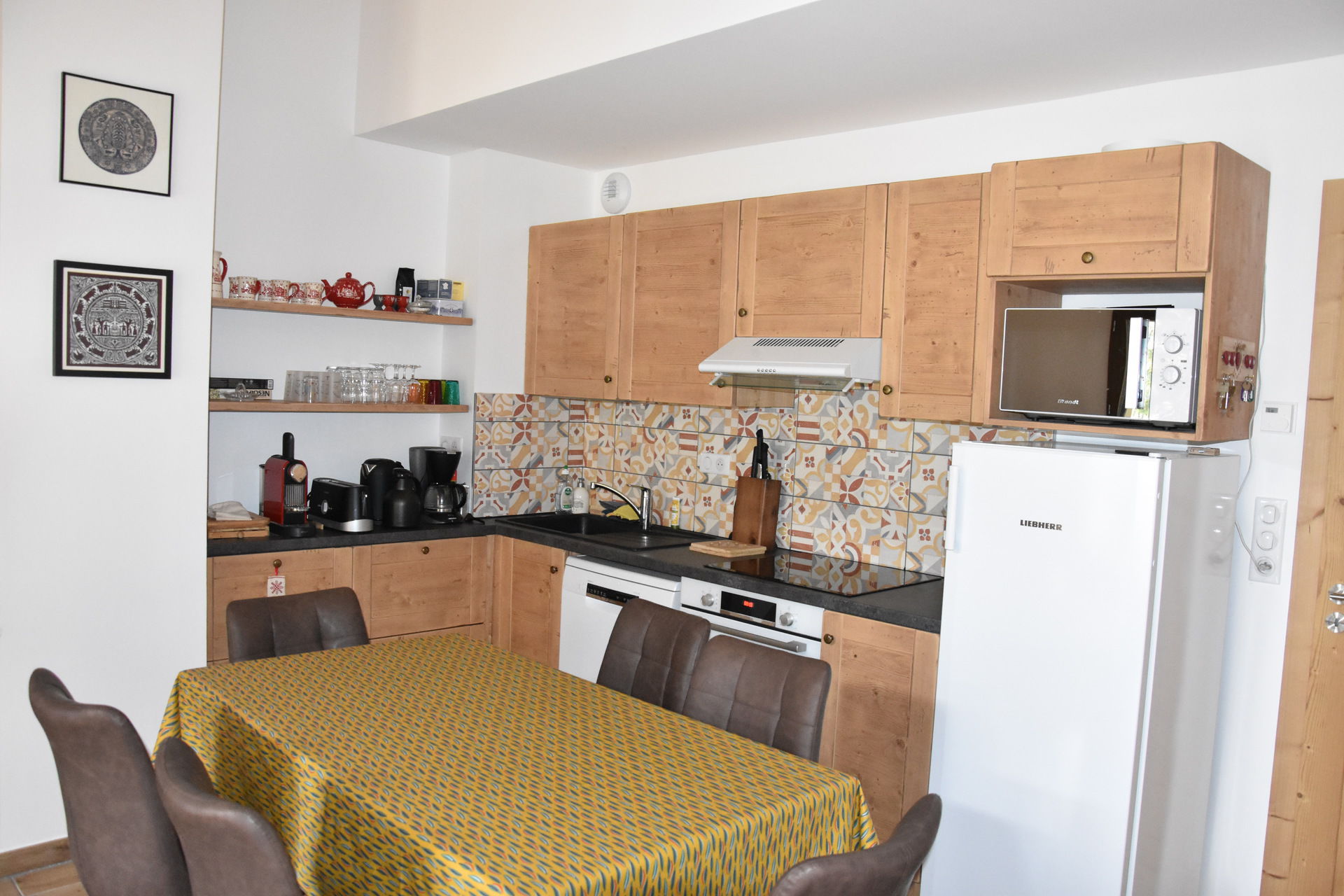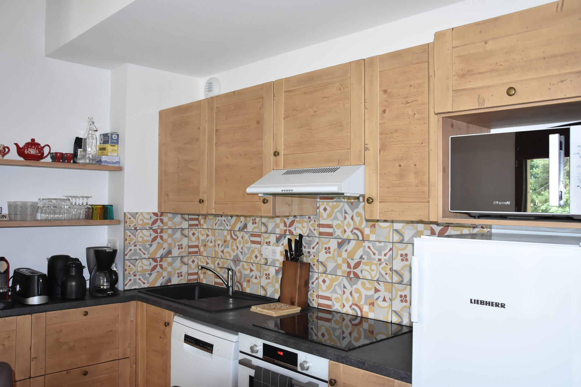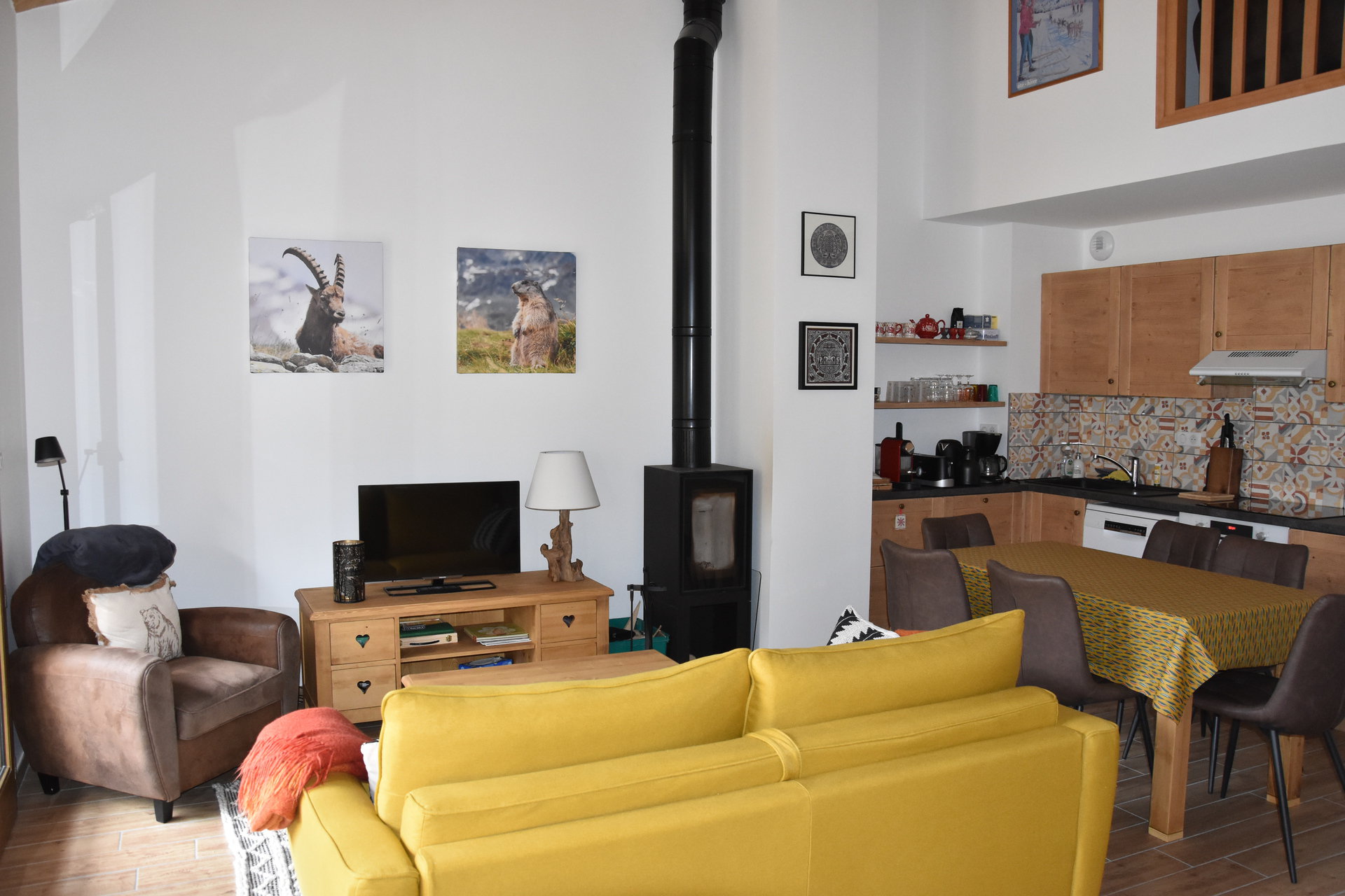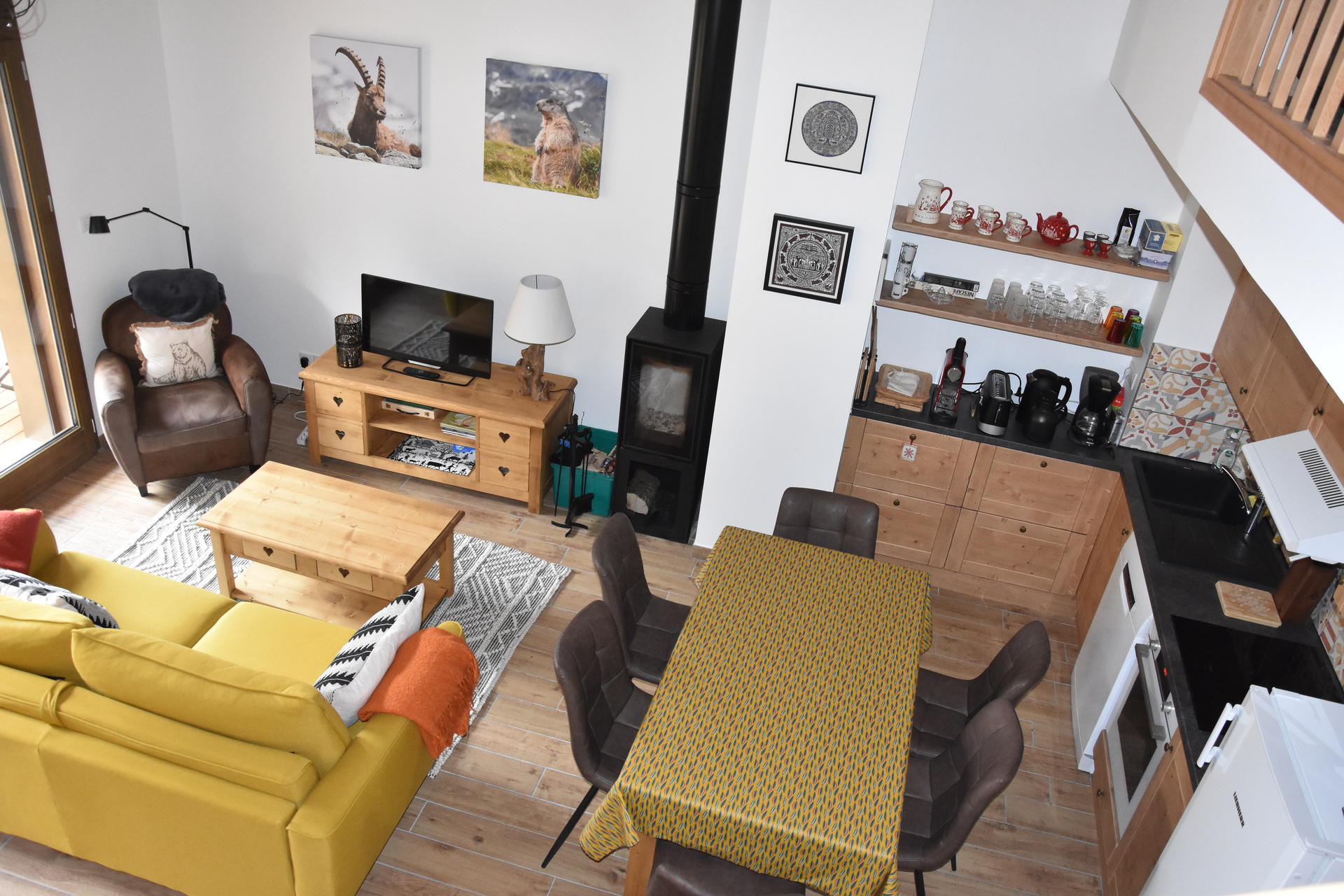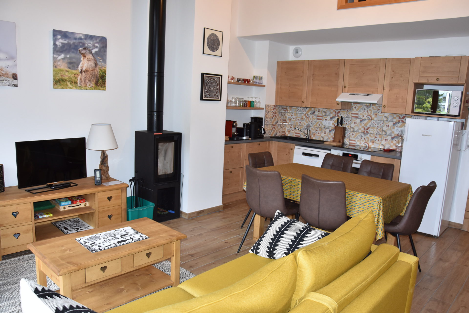 Séjour/cuisine (four, micro-ondes, frigo/congel, lave-vaisselle, plaque vitrocéramique, hotte) et canapé, poêle à bois, télévision.