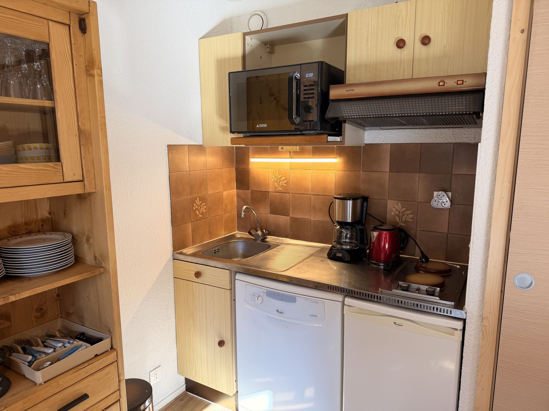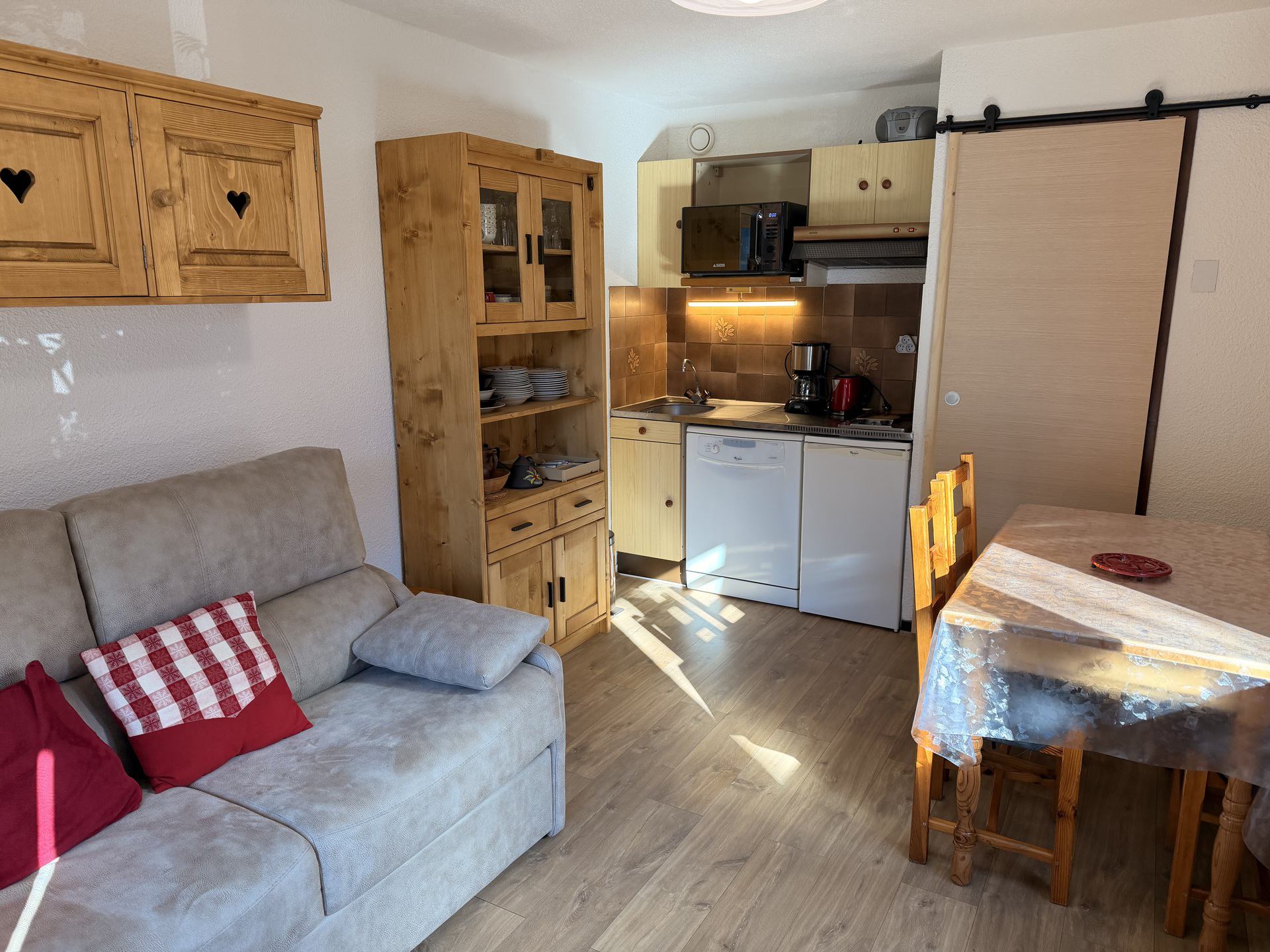 Séjour/cuisine (four, micro-ondes, lave-vaisselle, frigo, plaque électrique) et canapé lit en 140 cm, (télévision).